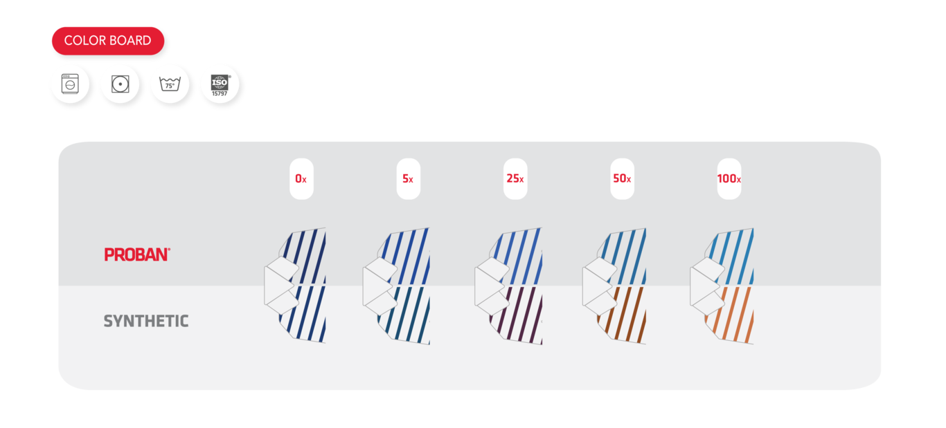 All fabric carrying the PROBAN® label and certification will have been tested to confirm its flame-resistant properties after at least 50 industrial washes and 50 dries, or more if the PPE standard requires, such as for compliance with NFPA 2112. This confirms the wash durability of all PROBAN® fabric batches.