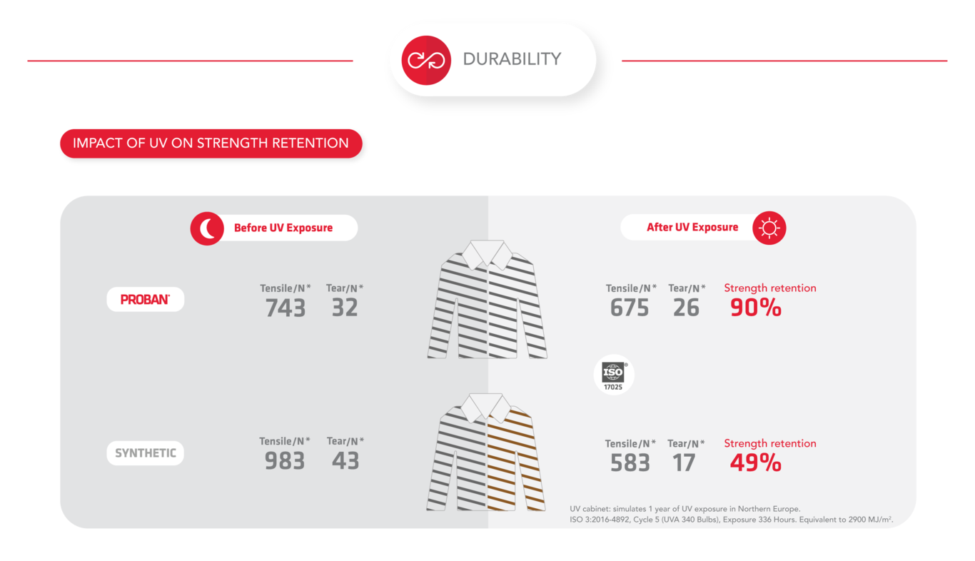 Most importantly, PROBAN® fabrics, compared to synthetic FR fabrics, have shown significantly higher retention of tear and tensile strength following exposure to UV light, as would be experienced by those working outdoors, particularly in hot, sunny climates.